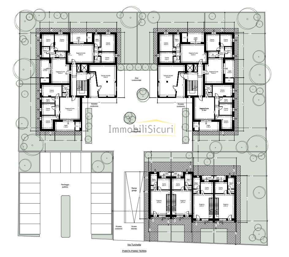 Al piano terra è troviamo appartamenti con due o tre camere e ampi giardini, mentre ai piani superiori verranno edificati appartamenti di diversa metratura con balconi in parte loggiati.